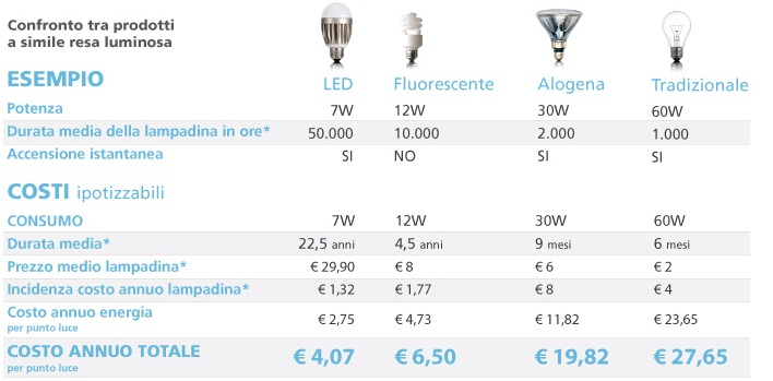 L’ esempio sopra riportato mette a confronto 4 lampadine con diversa tecnologia e simile resa luminosa. I dati sono puramente indicativi e si riferiscono ad un funzionamento giornaliero di 6 ore per 365 giorni, considerato un costo energetico di 0,18€ per KWh. Le caratteristiche contrassegnate con il simbolo (*) variano in base al prodotto acquistato.